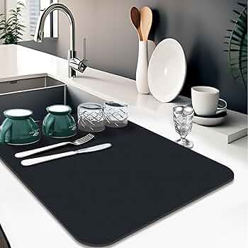 Versátil: es más que una simple estera para secar platos/frutas/verduras. Puedes colocarlo debajo de pequeños utensilios de cocina, licuadoras o tablas de cortar para proteger tu encimera. Nuestros tapetes para secar la cocina también son perfectos como tapetes para el cuarto de lavado, tapetes para la alimentación de mascotas, tapetes para la oficina, tapetes para el frente del fregadero, tapetes para el baño de vehículos recreativos y más.